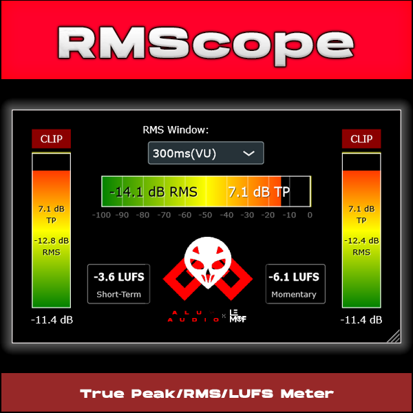 RMScope is a lightweight RMS, LUFS, true peak meter that provides real-time visual feedback of RMS/LUFS levels and true peak values.
